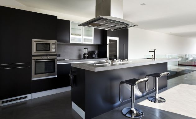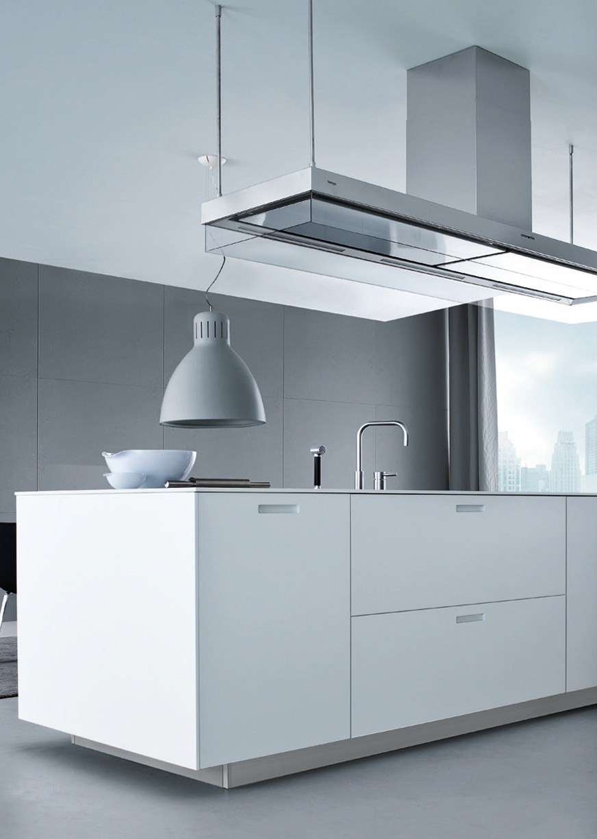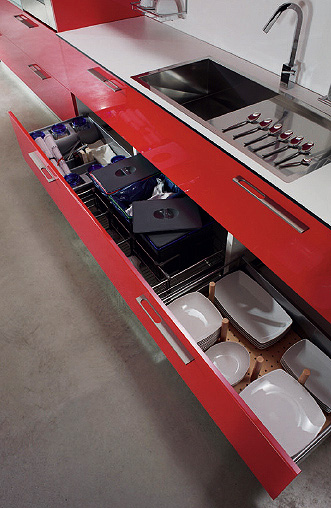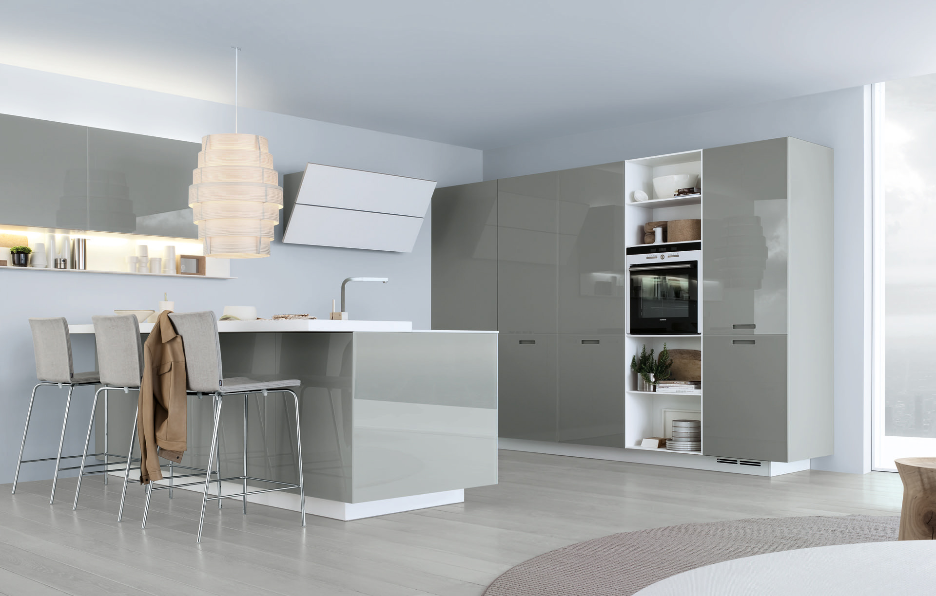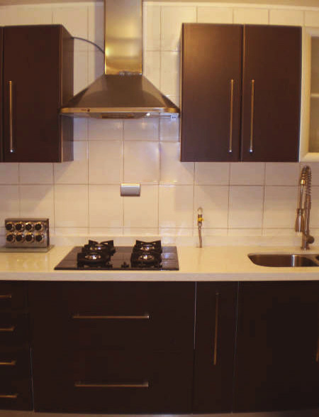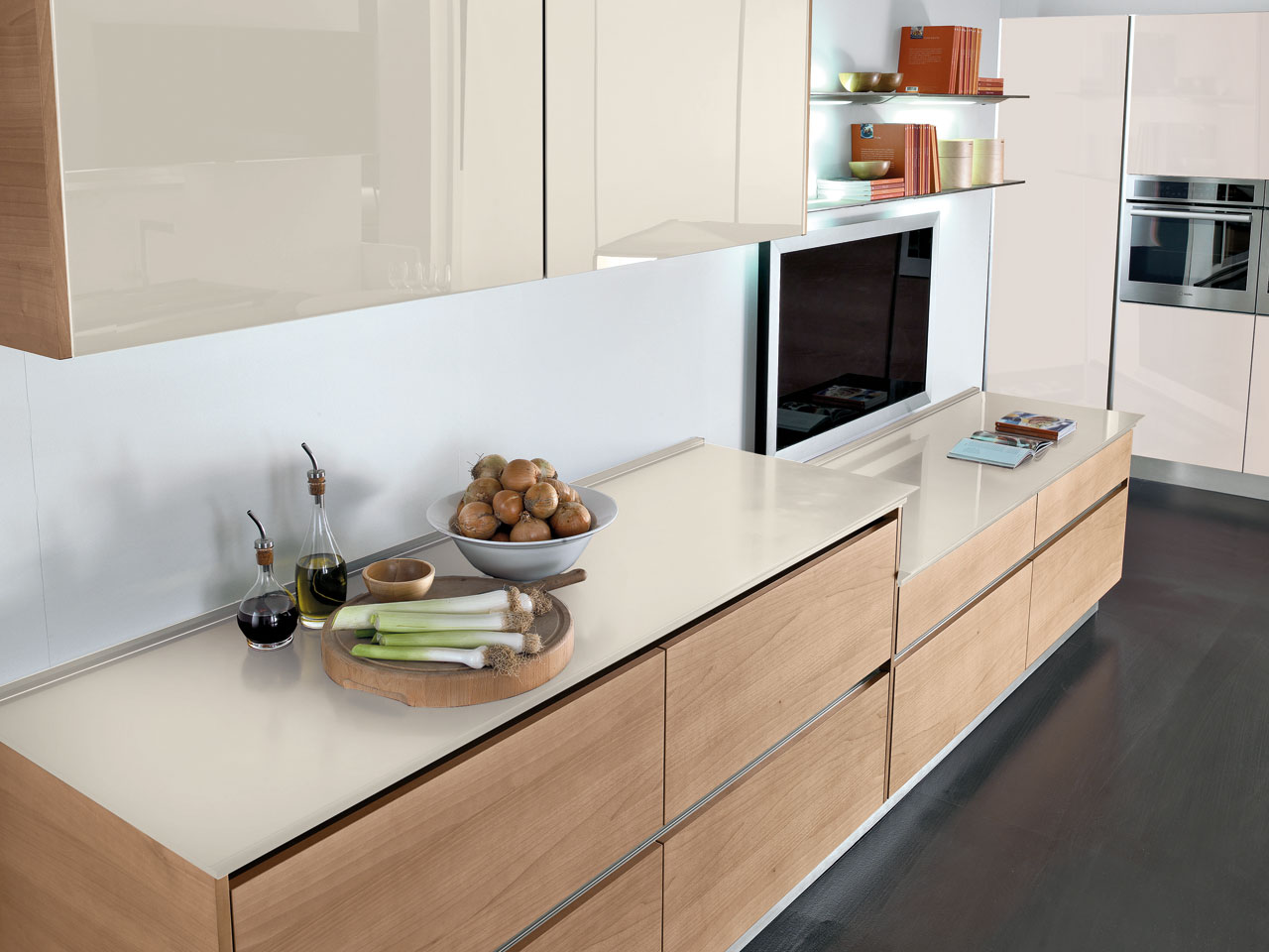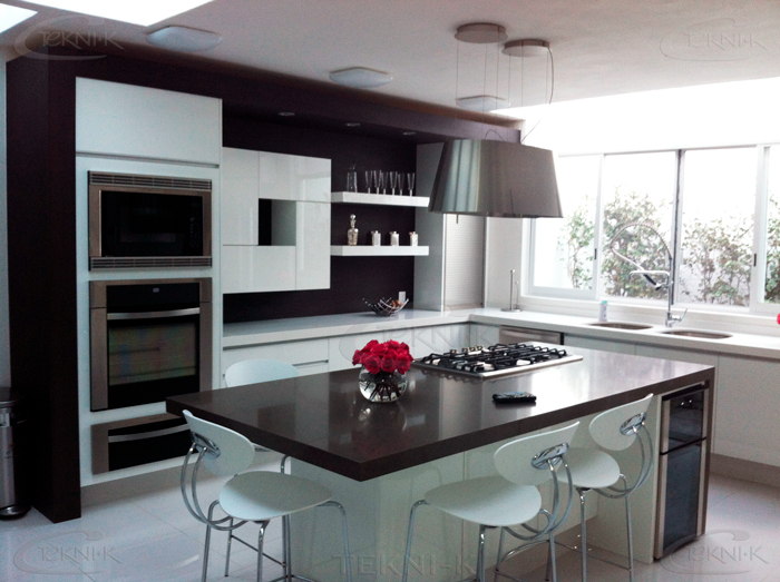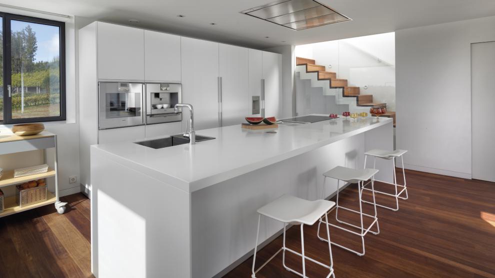 Puertas revestidas en PVC con rebajes decorativos, mezcladas con cubiertas en Silestone, granito o postformadas.