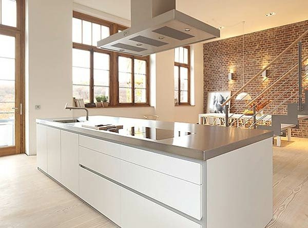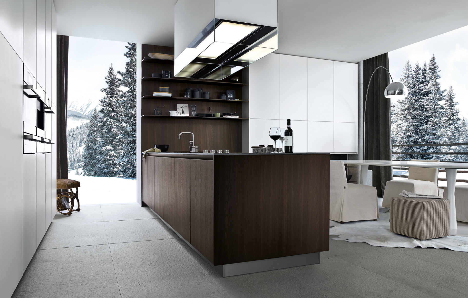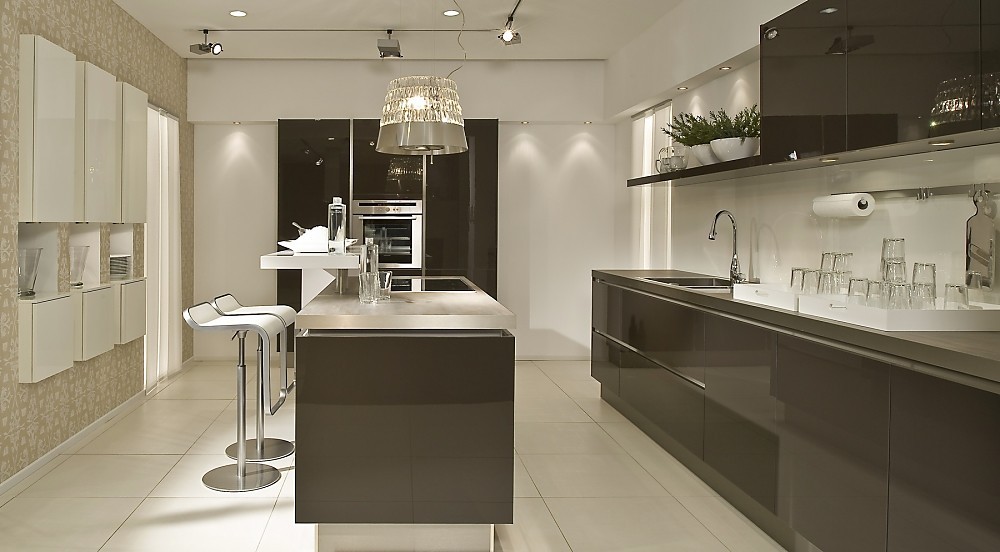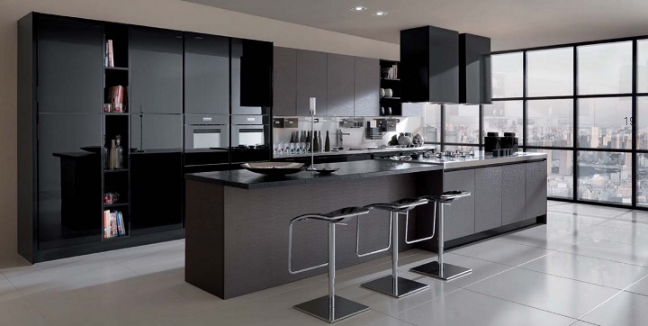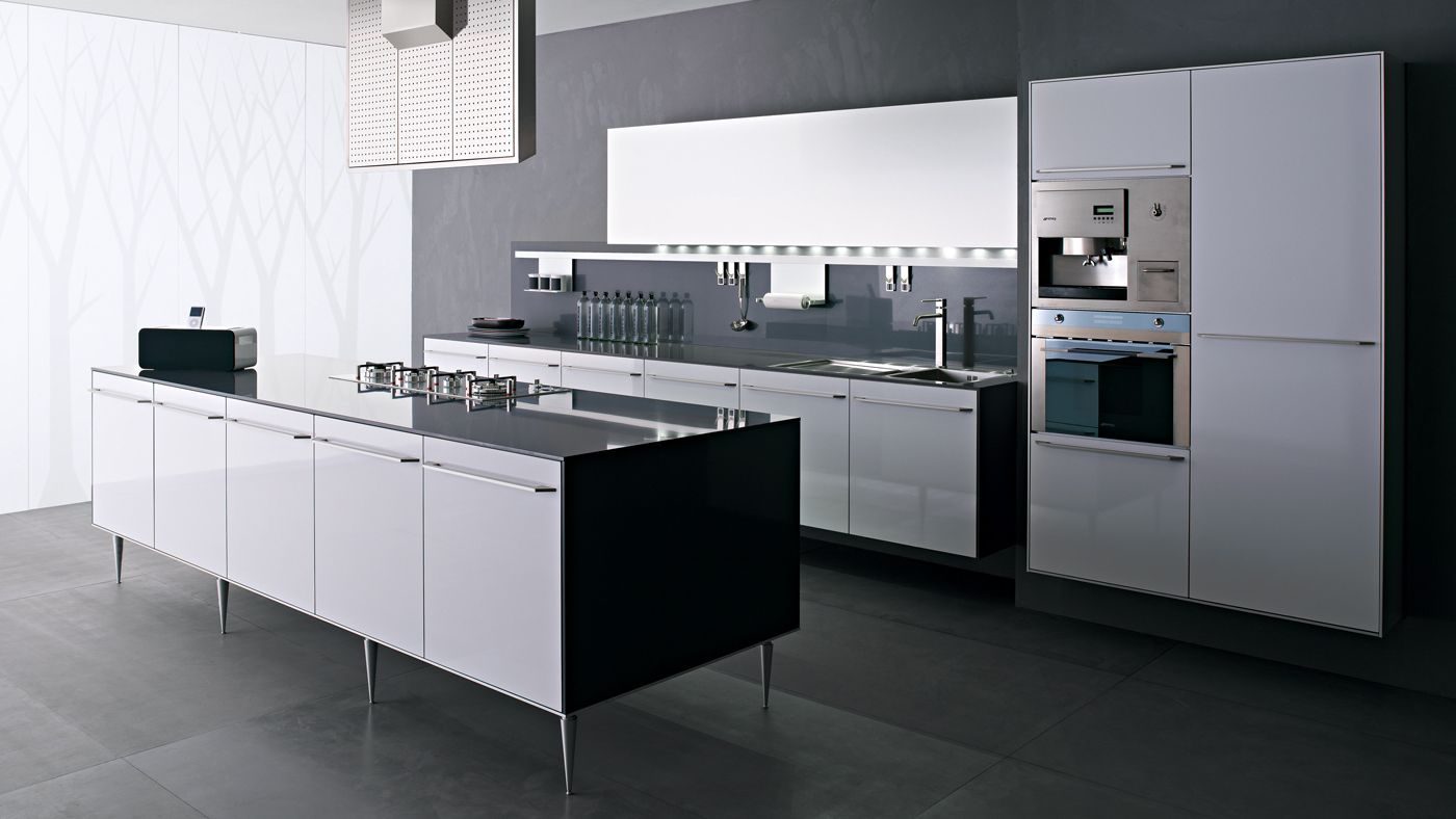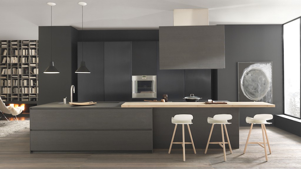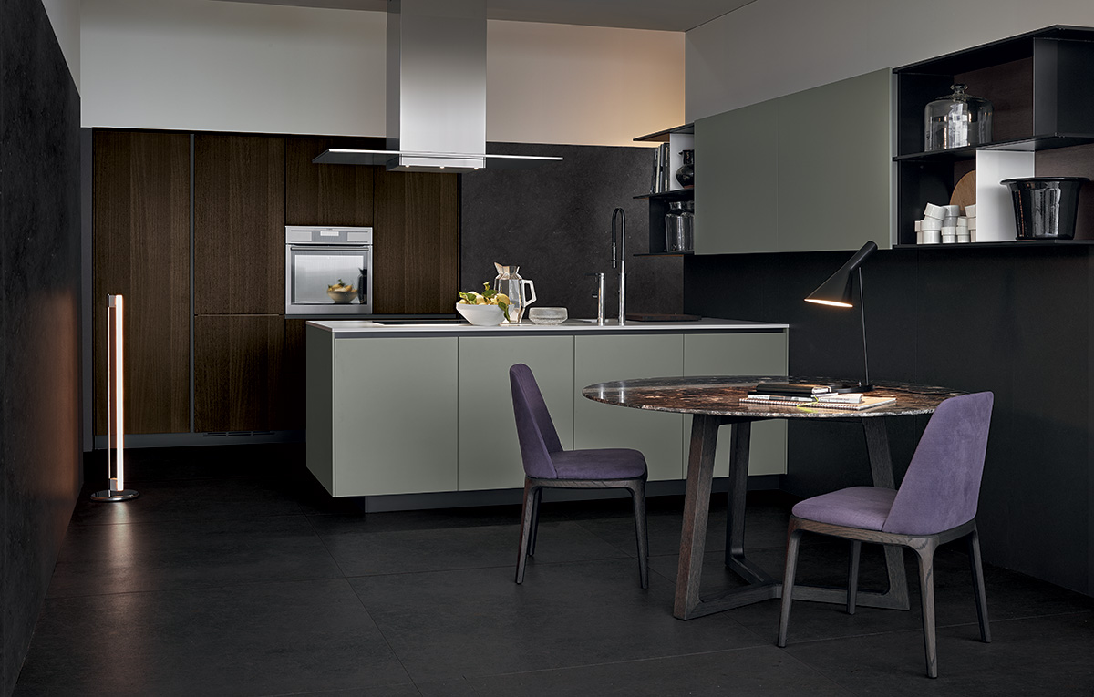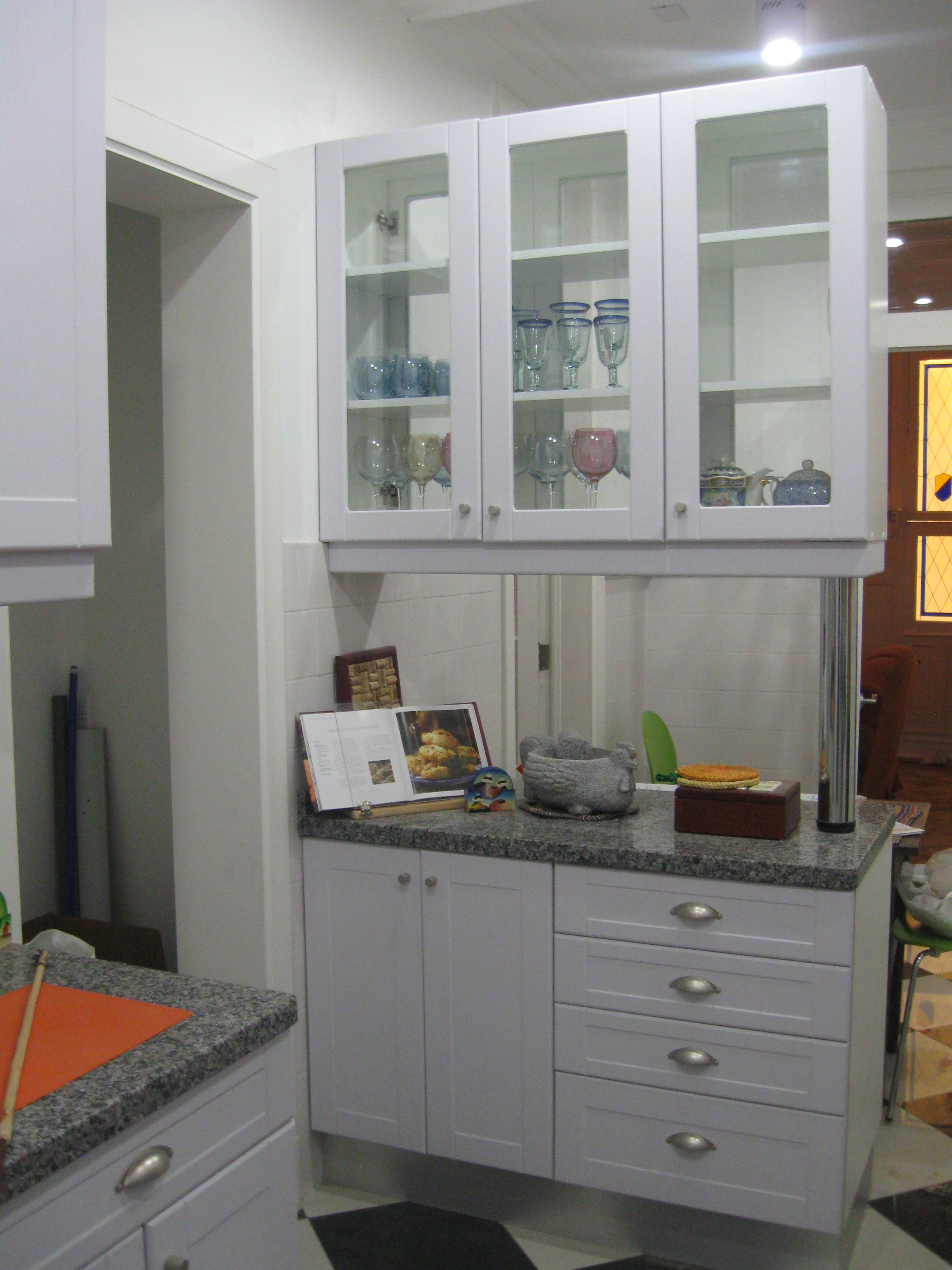 Puertas revestidas en PVC con rebajes decorativos, mezcladas con cubiertas en Silestone, granito o postformadas.